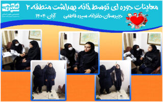 معاینات دوره ای شامل وضعیت کلی سلامت،قد،وزن و... توسط پزشک و کارشناس ارشد خانه بهداشت منطقه دو تهران در دبیرستان سیره فاطمی انجام گردید.